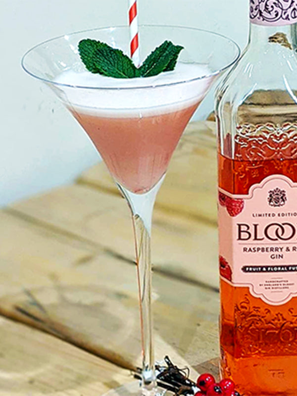 - In a shaker with ice, combine 50ml of BLOOM Raspberry & Rose Gin, 15ml of raspberry syrup, 15ml of lime juice, and 1 egg white.