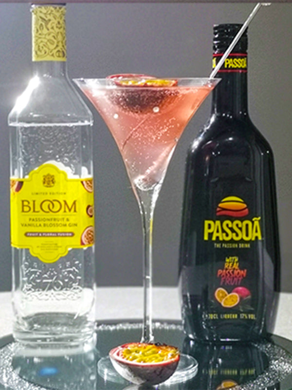 - Begin by pouring BLOOM Passionfruit & Vanilla Blossom Gin into a glass.